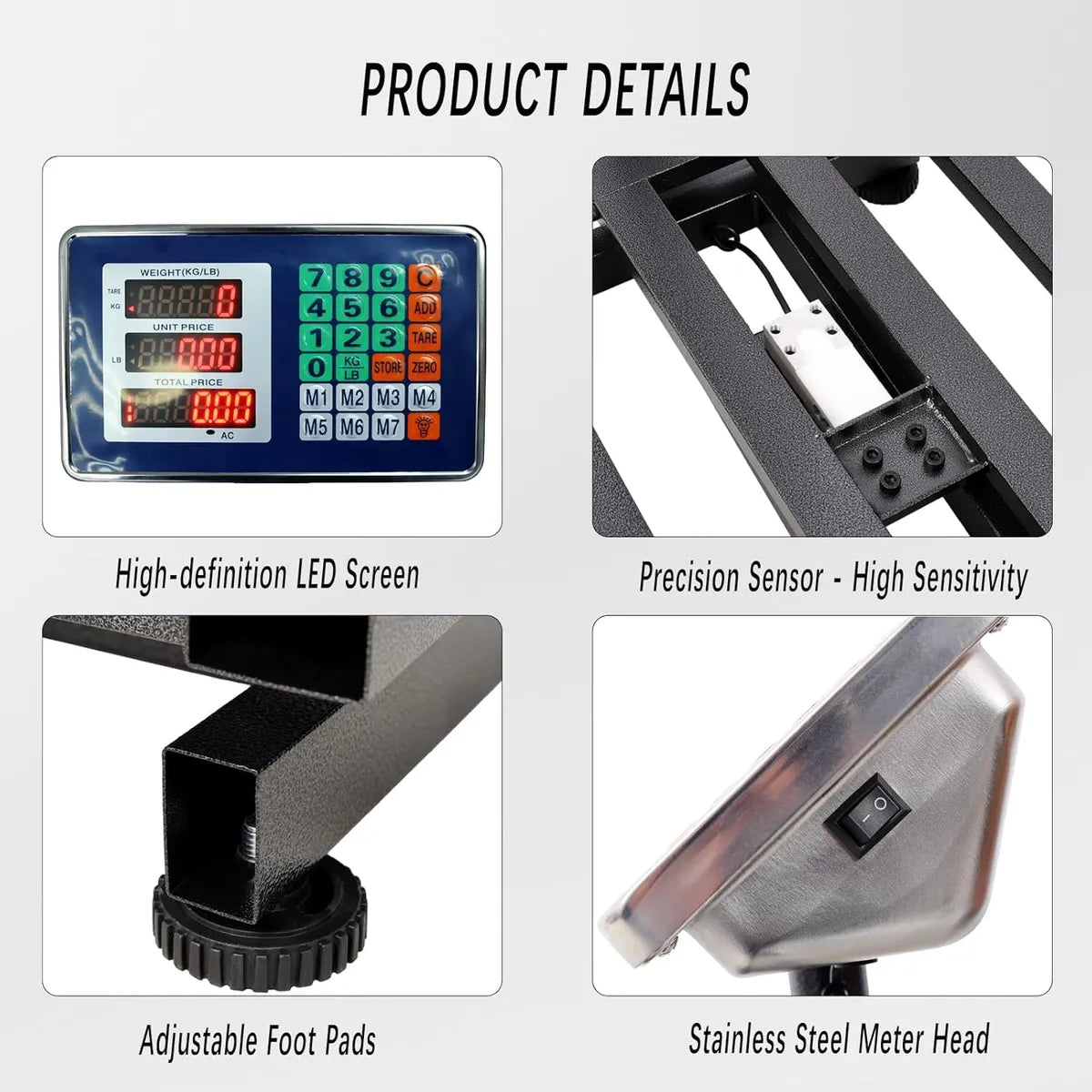 - Pantalla Digital de Triple Lectura: Muestra simultáneamente el peso, el precio unitario y el precio total, con luz de fondo LED verde brillante, visible incluso en exteriores.